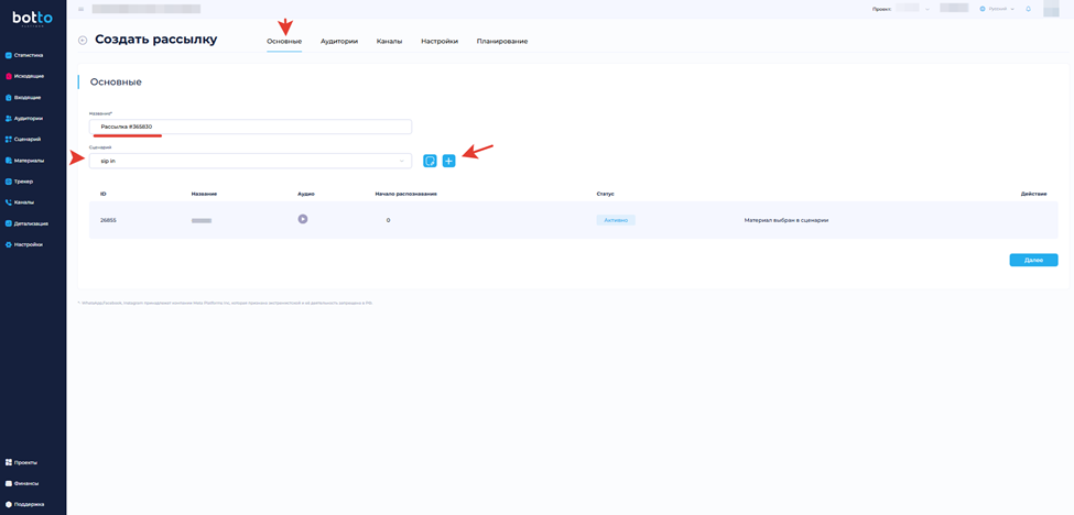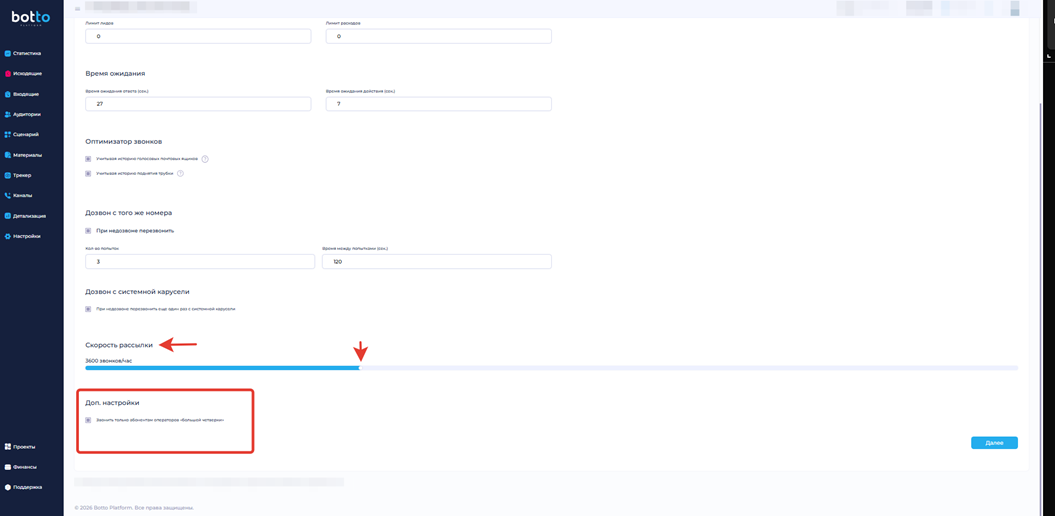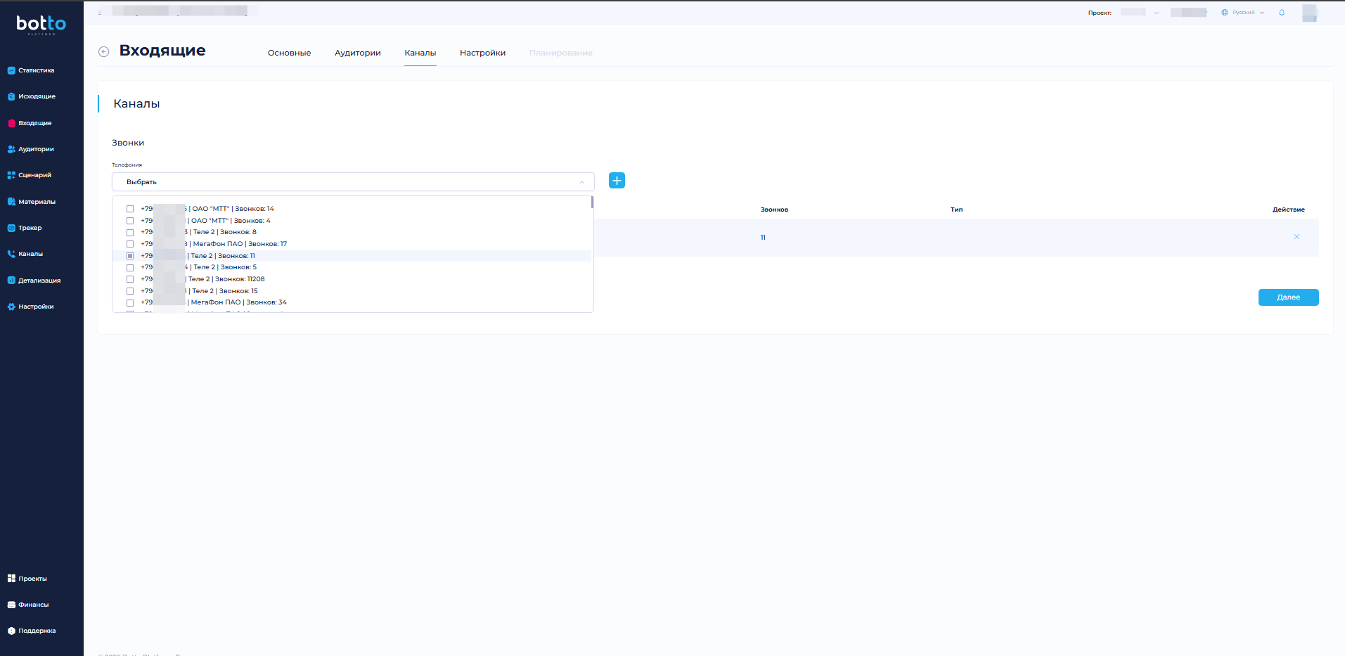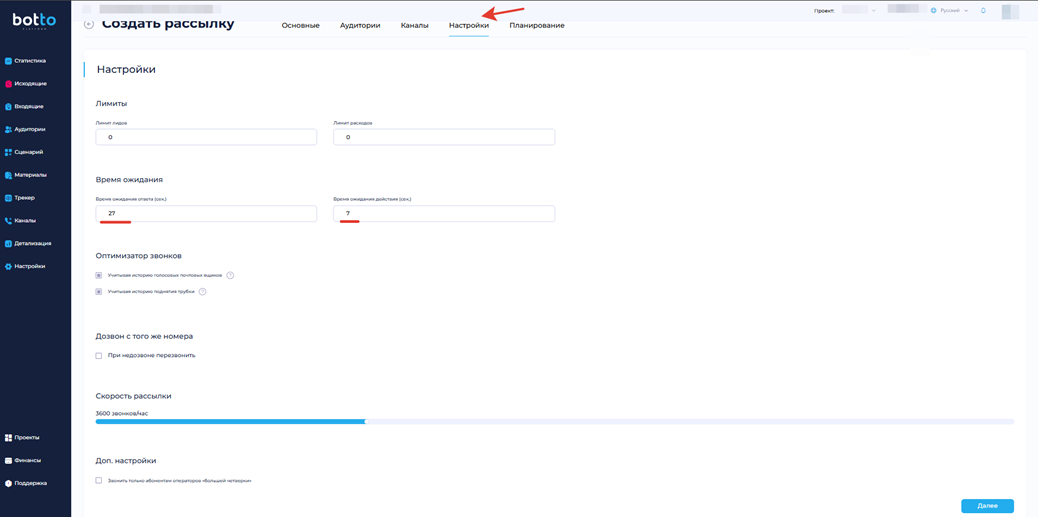 В выпадающем списке «Телефония» выберите ранее арендованные или арендуйте новые номера для обзвона и нажмите «Далее».