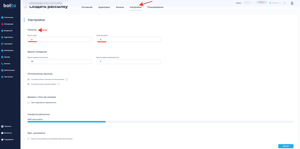 Лимиты вы можете установить максимальное количество лидов или лимит расходов, после которых рассылка будет поставлена на паузу.