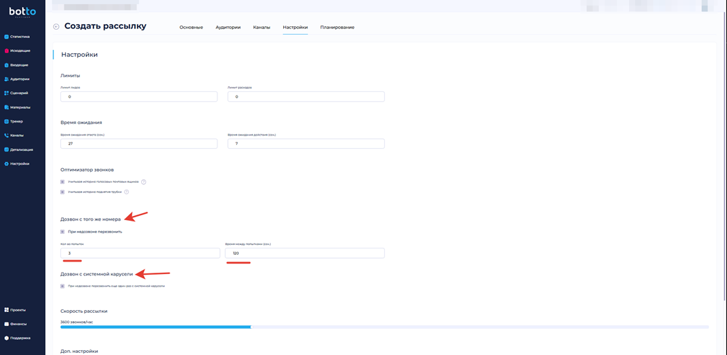 Поставьте галочку напротив пункта «При недозвоне перезвонить» и укажите число попыток, а также временной интервал между попытками.