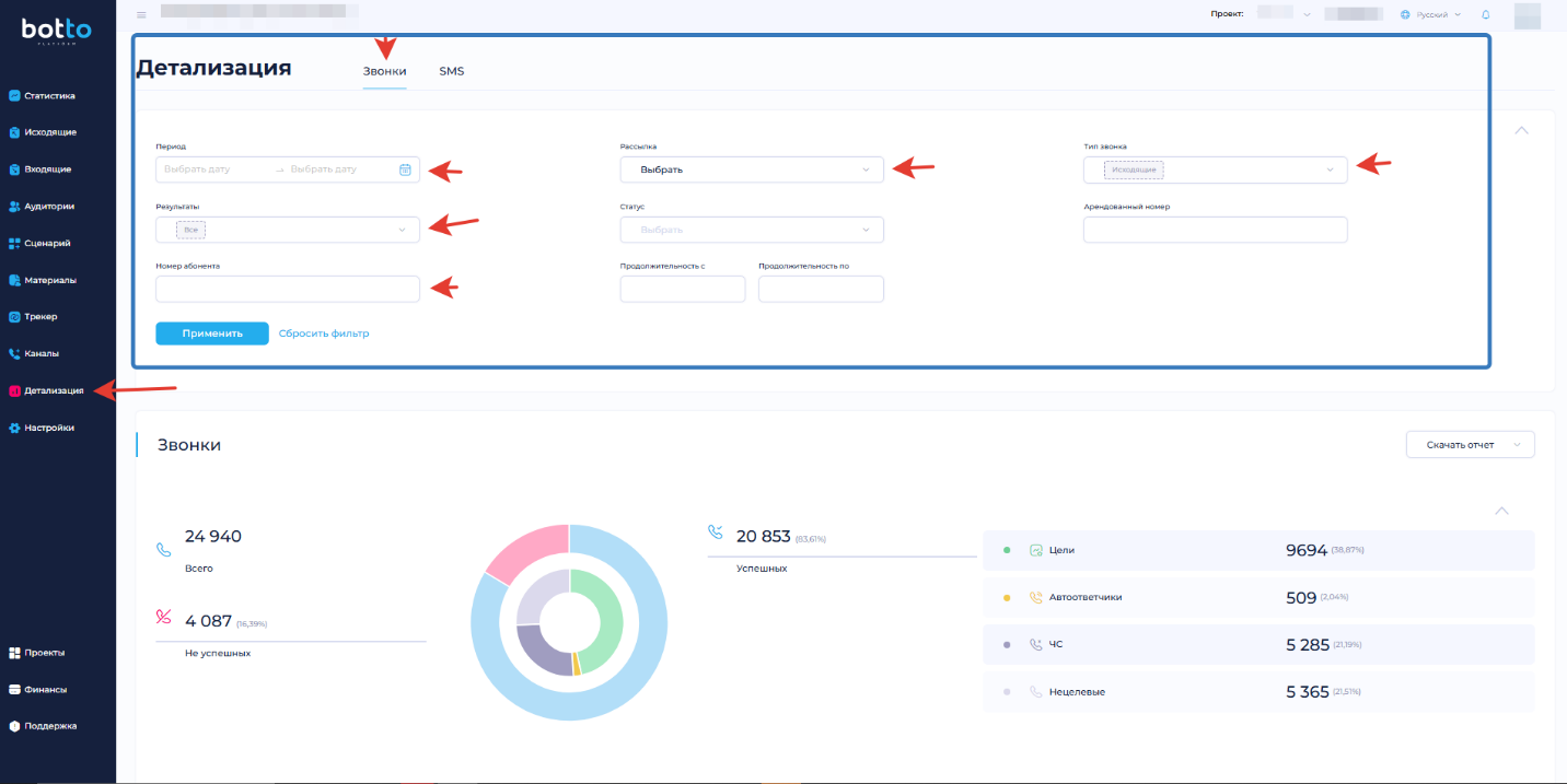 В разделе Детализация представлена информация о всех результатах коммуникаций в рамках голосовых и sms-рассылок.